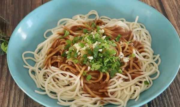 4。面条加少许香油拌匀,加少许辣味芝麻酱,加少许萝卜干,最后撒上葱末和蒜末。