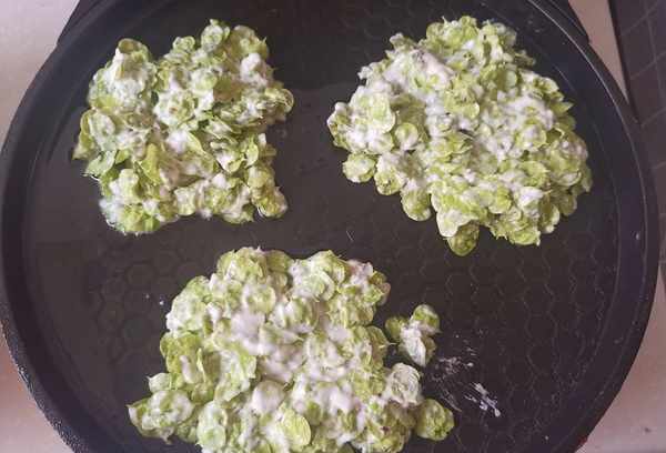 第四步:在电煎锅中加入少许花生油,用勺子将鱼干和面粉的混合物直接舀入电煎锅中,一个一个地摊成小饼,盖上锅盖煮2分钟左右。