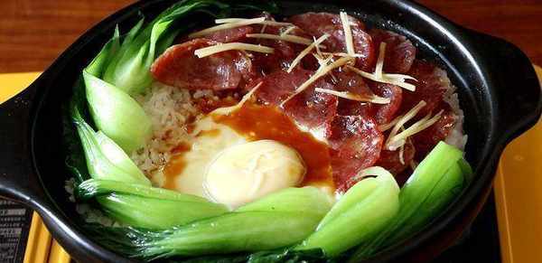 6。锅内烧开后,转文火煮至锅内无水,将腊肠片铺在米饭上,腊肠片上放姜末,中间放一个鸡蛋。