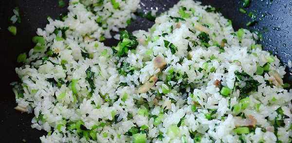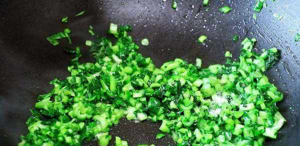 4。往锅里加油。油热后,加入切碎的绿色蔬菜,边搅拌边煮。加少许盐调味。