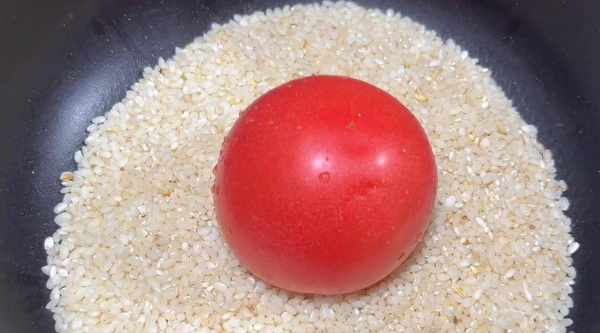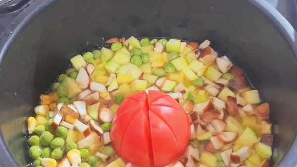 2。在番茄上面放一把十字刀。 3。将大米倒入电饭煲,再倒入玉米粒和豌豆粒,上面放一个西红柿,倒入适量的水,盖上锅盖蒸熟。