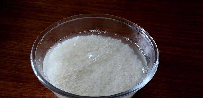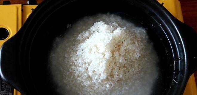 5.将米饭倒入锅中。水大约是大米的一倍半。把米饭铺在上面,盖上锅盖,用大火煮。