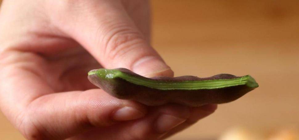 3。锅内加油,放入姜末翻炒。文火爆香后,加入猪肉翻炒变色,再加入扁豆翻炒。