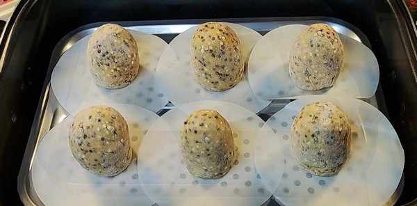 往蒸锅里加水,把蒸笼放在上面。将每个馒头盖上硅油纸,放入锅中,留出一定的空间,盖上锅盖,静置20分钟。20分钟后,全麦馒头会自然膨胀。用手指轻轻按压。可能会很快反弹,盖上锅盖大火蒸15分钟。