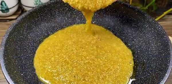 电煎锅预热并刷上食用油,将准备好的面糊倒入锅中,用锅铲抹平,盖上锅盖小火煮3分钟。