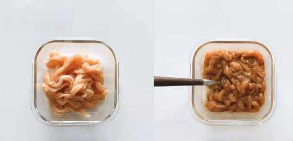 第二步:加一勺料酒去腥,加少许盐,少许生抽和蚝油,半勺老抽,撒少许白胡椒粉,最后加两勺淀粉,然后戴上手套抓匀,将鸡胸肉腌制20分钟左右,鸡胸肉鲜嫩可口,口感特别细腻。