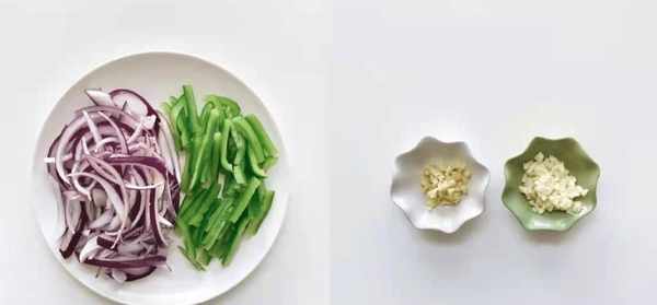 第三步:压青椒去掉青椒的籽,将青椒从中间切开,去掉一些白蒂和果肉,青椒切成几根细丝,一半洋葱切成细丝。