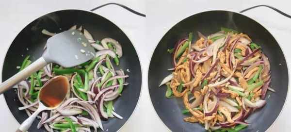 第七步:加入一勺生抽,生抽,提前放入炸好的鸡胸肉条,快速搅拌所有材料,锅中加入盐,少许生抽和蚝油,滴几滴滴上香油,翻炒片刻,出锅这道青椒葱爆鸡胸肉就做好了。闻起来很香,肉也很嫩。全家人都喜欢。