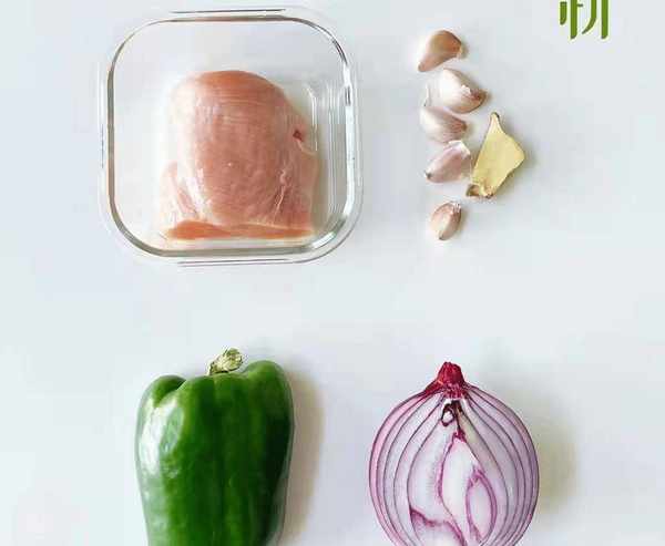 选料:买一大块优质鸡胸肉(鸡胸肉也叫胸肉,是鸡肉中最大的两块。这里的肉高蛋白低脂肪,是最爱很多节食者的。肉质鲜嫩,特别适合油炸。买鸡胸肉的时候,选择弹性好,颜色均匀的),选择一个青椒(可以选择灯笼椒,菜椒或者辣椒,但是一定很新鲜),买大蒜5瓣,姜几片,紫洋葱半根,水适量,淀粉两勺,生抽一勺,料酒少许,3克白胡椒粉、黑酱油、蚝油少许,橄榄油少许,香油两滴,其他。