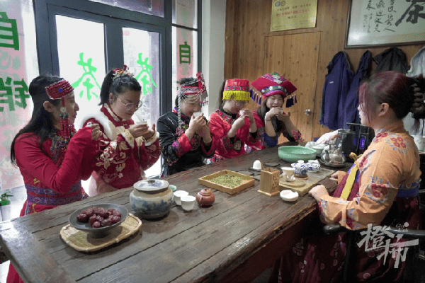 在拔山村第一家精品民宿“茶野”中,5位穿着各自民族服饰的小姐姐跟着穿汉服的杭科院旅游学院的学生,学习宋式点茶,体验宋韵茶文化。