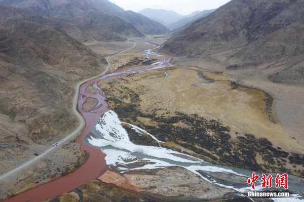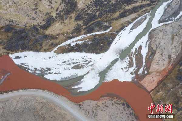 3月20日,青海省海西蒙古族藏族自治州都兰县,航拍两条河流在香加乡洪水川交汇处出现的“泾渭分明”景观。(无人机照片)