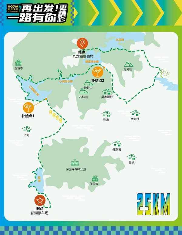 本次徒步路线:荪湖花海(起点)→富邦荪湖山庄→汶骆西路→精灵谷游客中心(第一补给点)→秦山临湖书吧→小洞岙水库(北岸)→九龙湖海景基地(第二补给点)→杜夹岙村→滨河绿道→九龙湖村→开元九龙湖度假酒店(终点),全程路线约为25公里。