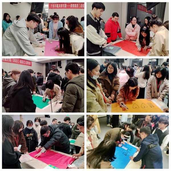 在商学院同事的主持下,动员大会进入了气氛热烈的“破冰”环节。先是“创作”——各小队将他们预先设计好的“队名”、“口号”、“队标”等原素由队内的“灵魂画手”绘制到队旗上。完成队旗“绘制”后,各小队在队长的带领下一一上台展示。在“团队展示”环节上,各队除了展示团队的队旗、口号,还一一介绍了各自的队内分工,“争心队”、“雄鹰队”、“我们这队”气势不凡,“吴彦组”、“V我60队”、“青春有你队”创意十足,而“五湖冲啊”、“成群结队”也秀出了不一样的团队风采。