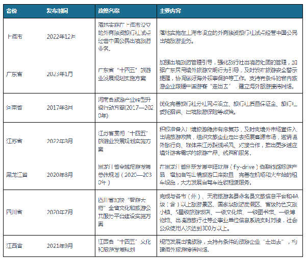 为了响应国家号召,各省市积极推动出境旅游行业的发展,比如广东省发布的《广东省“十四五”旅游业发展规划实施方案》提出加强出境旅游管理引导,强化旅行社出境游组团的管理,加强广东居民境外旅游文明行为引导,及时发布旅游安全警示提醒,协调做好海外领事保护等工作。支持有条件的省内旅游企业跟随中国游客“走出去”,建立海外旅游接待网络。