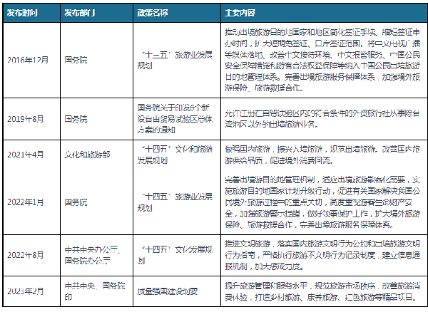 根据观研报告网发布的《中国出境旅游市场运营现状分析与发展战略研究报告(2023-2030年)》显示,近些年来,为了促进出境旅游行业的发展,我国陆续发布了许多政策,如2022年国务院发布的《“十四五”旅游业发展规划》提出完善出境游目的地管理机制,适应出境旅游散客化需要,实施旅游目的地国家计划升级行动,促进有关国家解决我国公民境外旅游过程中的重点关切,高度重视游客生命财产安全,加强旅游警示提醒,做好领事保护工作,扩大境外旅游保险、旅游救援合作,完善出境旅游服务保障体系。