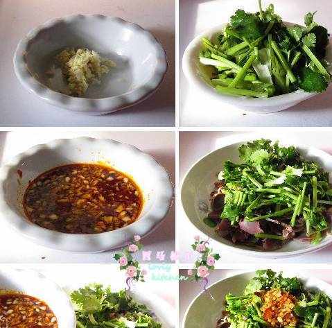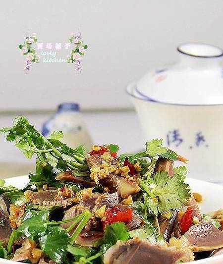 9香菜洗净切成寸段。10将香菜和鸭胗片混合。
