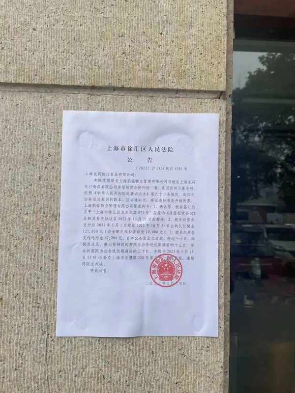 门外的墙上贴了一张徐汇区人民法院的公告。公告显示,作为被告的上海克莉丝汀食品有限公司已经拖欠了半年左右的房租,金额为12.16万元。