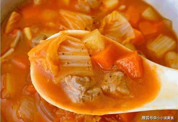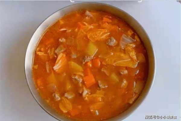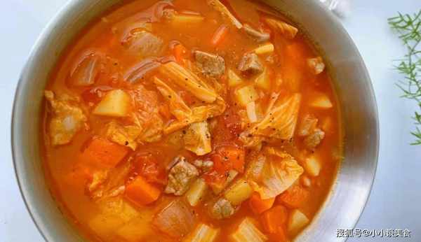 食材选择:牛排肉约350克、卷心菜约180克(或选择娃娃菜,但一定要新鲜)、胡萝卜一根、大土豆一个、西红柿一个、圆洋葱一个、油少许、盐适量数量。、胡椒粉适量、水适量、番茄酱适量、鸡高汤适量等材料。