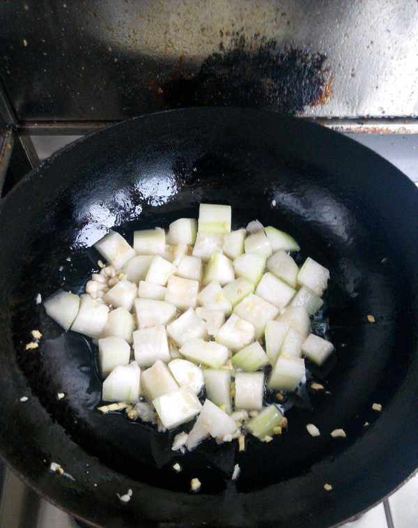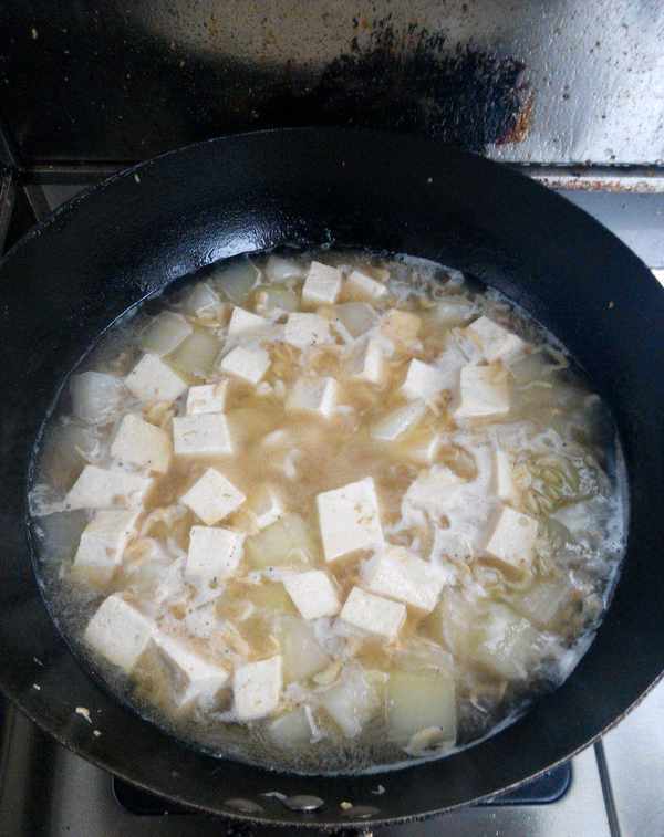 第四步:加入足量的热水,待冬瓜汤沸腾后,放入豆腐稍煮,加入料酒去腥。