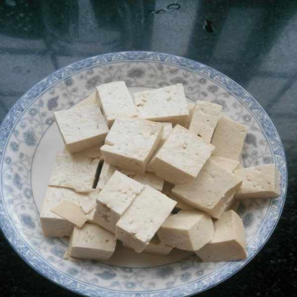 第二步:一块豆腐用冷水浸泡,豆腐切成小块,锅中烧开热水,将豆腐放入锅中,煮一分半钟,捞出。可能会有味道,把剩下的水倒掉。