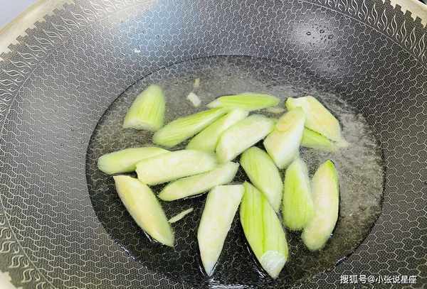 4:锅底全部烧热,加入猪油融化,加入蒜片和姜末,炒香,将丝瓜片全部放入锅中,丝瓜片翻炒片刻,丝瓜片变软.