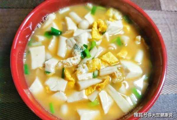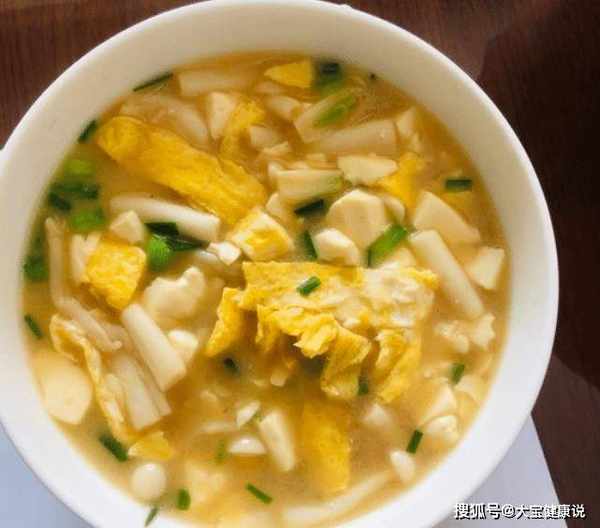 小贴士:白腰菇豆腐汤是素食。白色肾炎菌的根很脏,必须剪掉。白玉菇也需要焯水一次,水份一定要过关。漂烫可以去除里面的有害物质。不要把这汤里的豆腐直接下锅。你需要把豆腐烫一次。蛋壳里多放鸡蛋,少放面粉。.做这道豆腐汤,锅底加入猪油,加入姜末翻炒,然后加水烧开,加入豆腐块和白玉菇,最后加入蛋胎,调味调味,加入香油、盐和胡椒粉,最后撒上葱花。