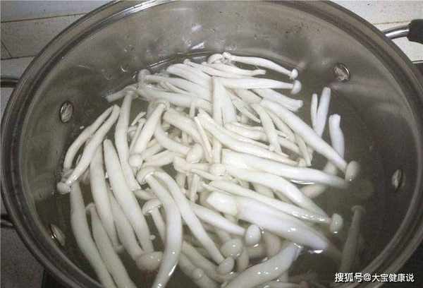 第一步准备:先把选好的白玉菇洗干净,然后用刀把根切掉,然后准备一大锅热水,在里面撒盐,把白玉菇煮2分钟,然后泡进去冷水,然后沥干水分备用。