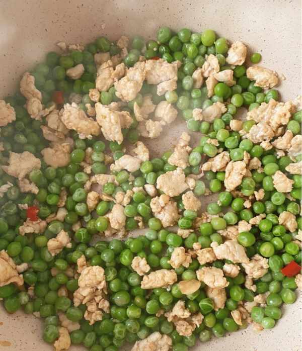 第七步:最后加入少许香油,翻炒几下即可起锅。这道青豆炸鸡胸肉就做好了。色泽漂亮,好吃又满足,尤其是食欲。