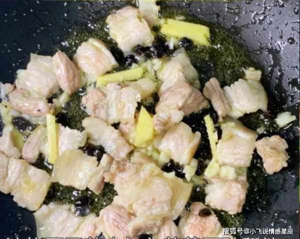 第五步:锅底加少许食用油,放入姜末和蒜末,放入肚皮翻炒出肥肉。不要忘记用高温油炸。