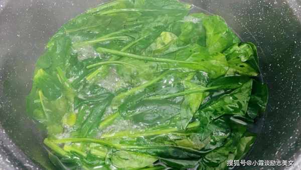 第二步:另一锅水烧开,加入少许菠菜晾干,撒一滴盐,加少许食用油,将菠菜焯20秒去除叶子中的草酸,浸入冷水中,挤干晾干备用。