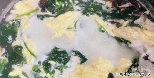 第七步:加入少许菠菜稍微煮一下,然后加入鸡精和鲜味,撒上葱花,也可以用狼来装饰,出锅,还有这个菠菜,香菇,香菇和鸡蛋.现成的滴水汤。