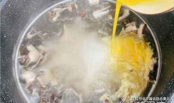第六步:加入香菇片,加少许盐,加少许白胡椒粉,中火加热略煮,将蛋液倒入锅中,蛋液呈块状。