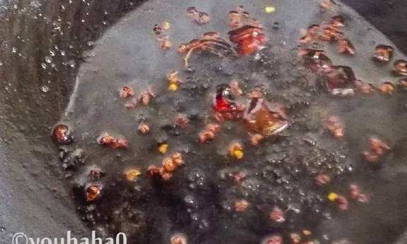 3、腌黄瓜的时候,准备麻辣酱汁:炒锅放适量的植物油,放入干红椒、花椒炸出麻辣香味,放入酱油、白糖、少许的米醋烧开,放凉待用。