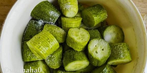 2、然后四公分左右切一段,撒适量的盐腌渍一个小时左右,盐不要多,黄瓜不要太咸。