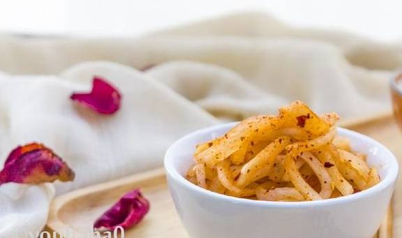 4、蘸水就是调味的辣椒面,萝卜丝上撒一点蘸水拌匀,装入容器中放入冰箱冷藏保存,第二天早晨就可以吃。
