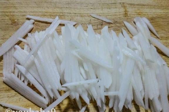 1、一个白萝卜洗净,切片后切丝,不用切的太细。