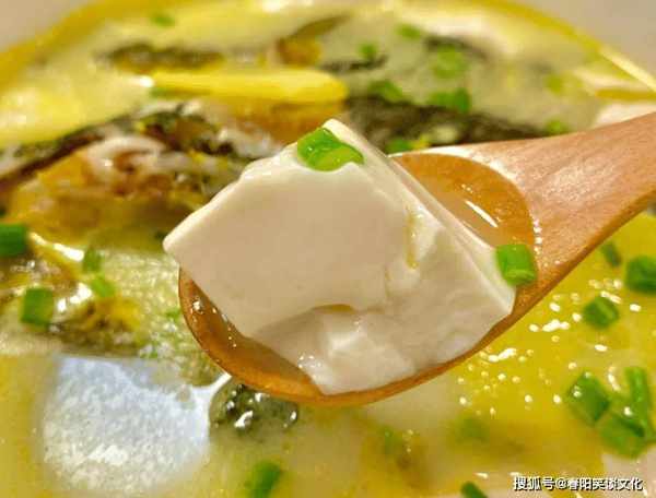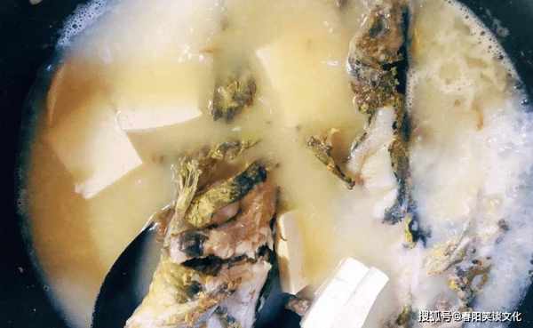 5:待汤汁由黄骨变白时,加入酸菜块,中火煮几分钟,加入豆腐几块,小火慢炖片刻,鱼汤即出可口的。.