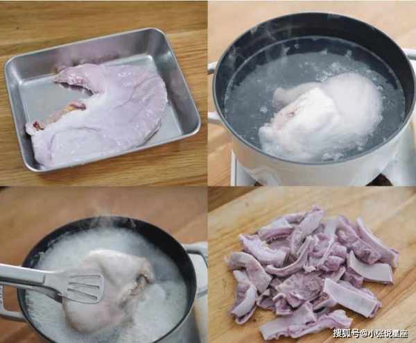 第三步:锅内放适量水,五花肉冷水焯一下,分别放入葱姜,加入黄酒和料酒,盖上锅盖煮5分钟,捞出用热水洗净反复,将五花肉切成条状备用。