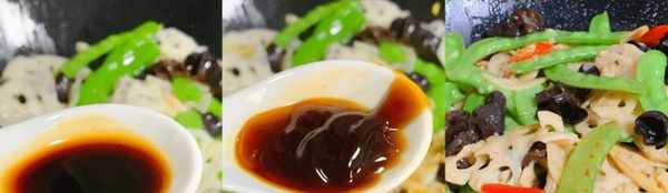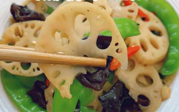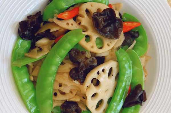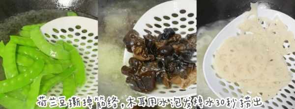 烹饪技巧:莲藕、荷兰豆、黑蘑菇要选好。一些成分已经漂白了一段时间。这个炸藕片的顺序和火候,荷兰豆和香菇是比较难控制的。