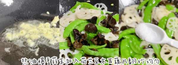 第五步:锅底加入色拉油,加入蒜片快炒,加入荷兰豆、黑蘑菇和藕片炒至断。