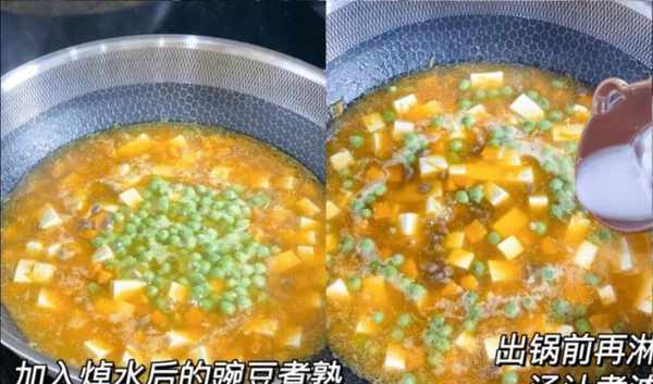 第二:豆腐用清水泡一下,防止变质。取出豆腐,切成小方块。青豆去皮洗净放入锅中,加水和盐入油中煮熟,2分钟后捞出备用。焯水后的豌豆色泽更好,口感更好。