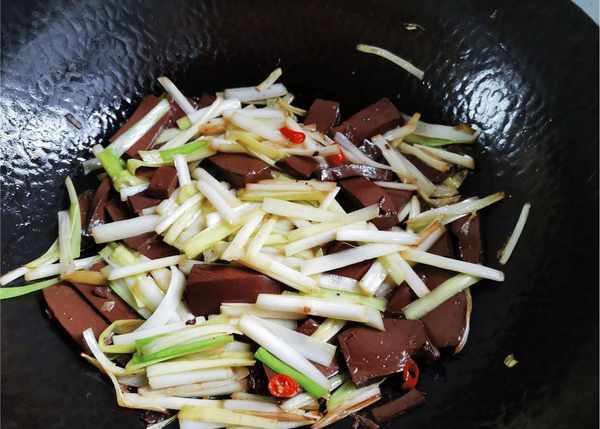 第九步:撒上几片小米椒,加些香葱炒软调味,装盘。这道酸辣可口、营养极其丰富的韭菜炒鸭血就做好了。