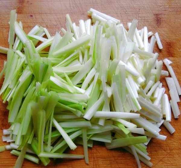 第三步:鸭血泡冷水,检查干鸭血块的水分,小米椒切小块,葱切根,葱花切段,开始煮这道炸鸭血。与韭菜结块。