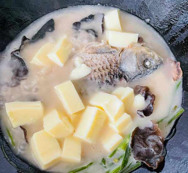 第七步:咕噜咕噜放入切好的鸡蛋豆腐中焖几分钟,待豆腐汤呈白色,将鲫鱼汤的鲜味在汤里煮开。