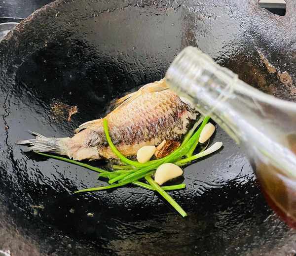 第五步:锅下锅,中火煎至两面金黄,鲤鱼去皮煎另一面,加少许料酒、葱蒜末加适量水。盖住鱼。
