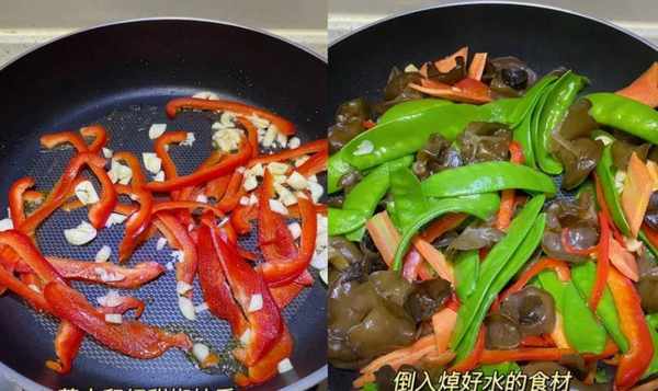 步骤5:锅底加入少许食用油,加入蒜末炒香,加入红辣椒末炒至生,交替加入荷兰豆、黑蘑菇和胡萝卜,炒至生。
