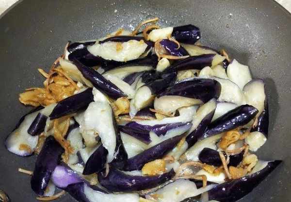 第四步:放入切好的茄子块,将茄子炒软,快速翻炒几下,锅边放少许水,盖上锅盖小火炖一会,开始准备鱼香酱.