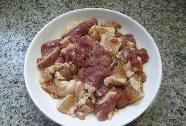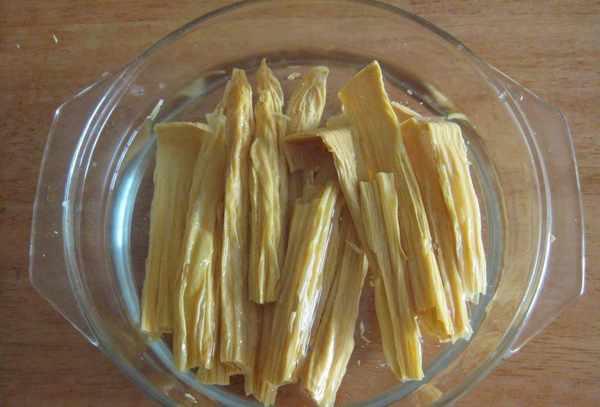2:泡好的腐竹用冷水泡一下,捞出切成等长的块,猪肉洗干净,用刀切成几块备用。