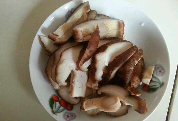 5:香菇切去顶部,用盐水洗净香菇,用热水煮香菇,香菇切成数片,姜蒜分别切丝,葱卷切成薄片并准备小块和所有成分。让我们开始做香菇豆条烧肉吧。