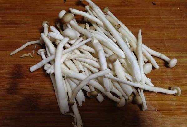 4:先将白玉菇和蟹味香菇放入盐水中,香菇切去根部,洗净,放入油锅中,加少许盐烧开,稍煮片刻变白。